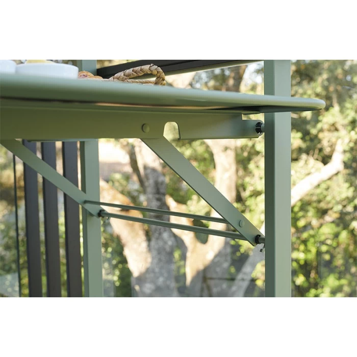 Vous l’avez compris, cette pièce s’adaptera à tous les balcons, mais pas que, vous avez aussi la possibilité de la fixer contre un mur ou l’accrocher à une ballustrade avec son système de fixation réglable en inox. La table dispose également d’un bac de rangement, vous offrant la possibilité de décorer votre balcon ou d’y ajouter vos boissons & condiments de cuisine.